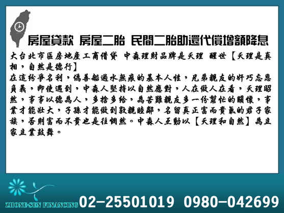 大台北市區房地產工商借貸中森理財品牌是天理 醒世【天理是真相,自然是德行】